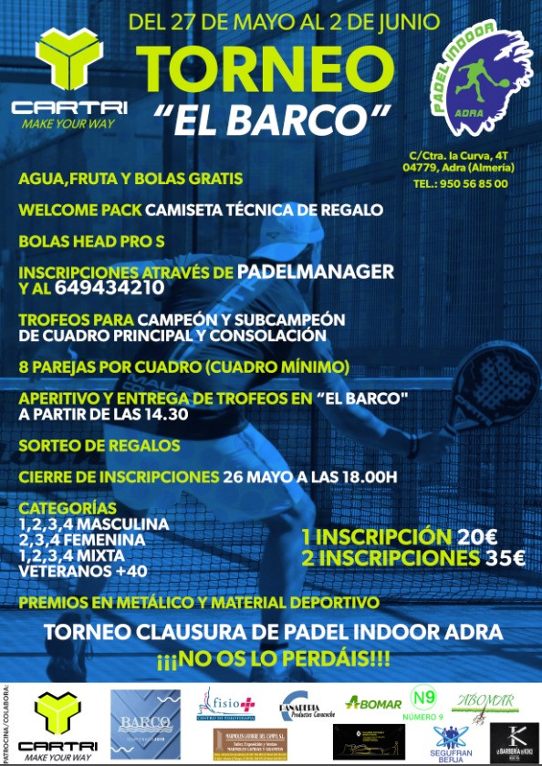 Bienvenidos a PADEL INDOOR ADRA,disponemos de unas estupendas instalaciones bajo cubierta bien comunicadas desde cualquier punto del poniente a almeriense para practicar tu deporte favorito durante la epoca del año que prefieras. DISPONEMOS DE: ·Cuatro pistas con paredes de cristal y cesped artificial ·Bar-cafeteria abierto a las pistas y con tv para ver tus deportes favoritos. ·confortables aseos,vestuarios y duchas. ·gimnasio ·zona de juegos para los mas peques. ·tienda de padel especializada en nuestra principal marca CARTRI ·CLUB OFICIAL CARTRI
