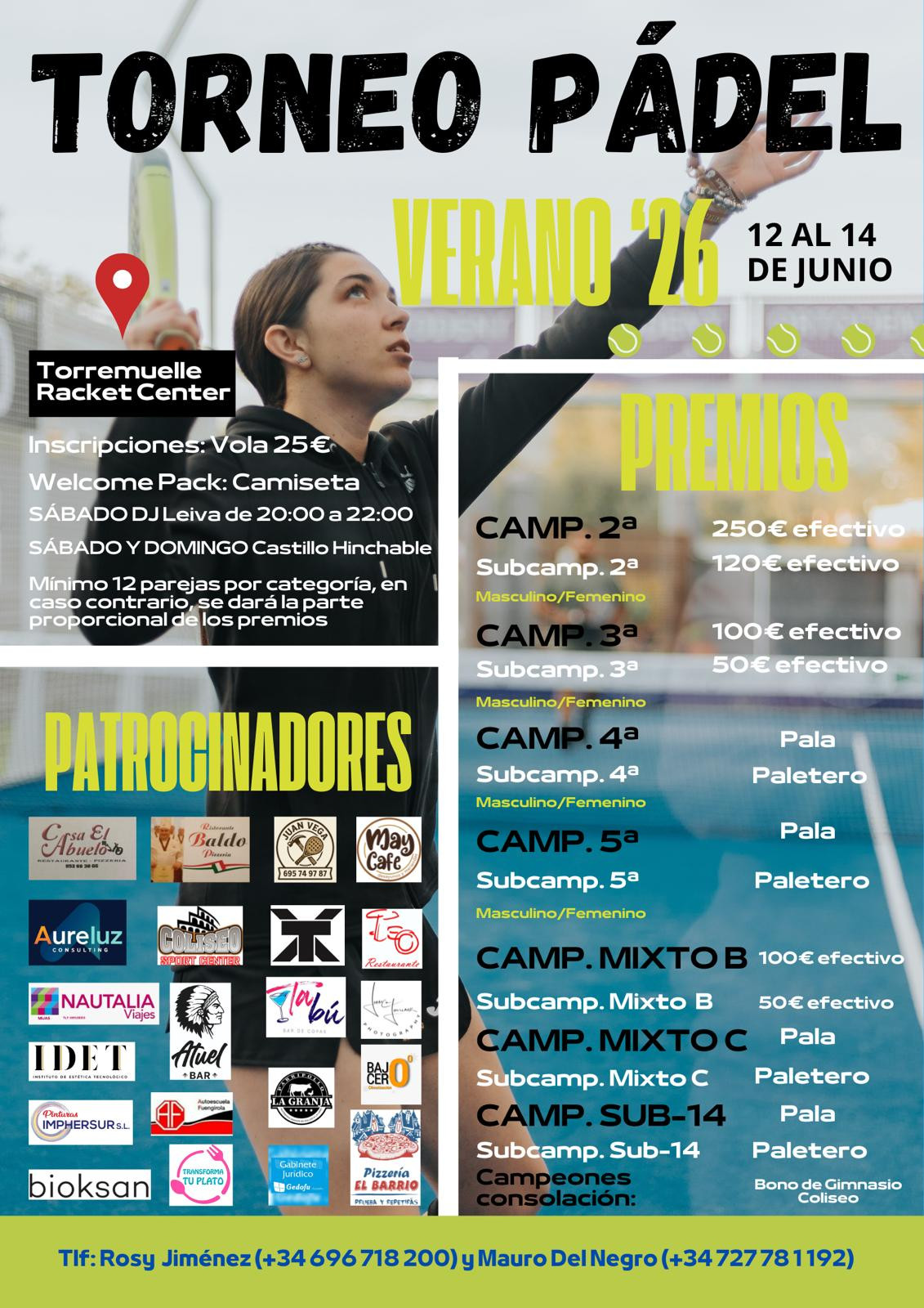 Premios: PRIMERA MASCULINA Campeones:200 Subcampeones:130 SEGUNDA MASCULINA y SEGUNDA FEMENINA Campeones:120e Subcampeones:60e TERCERA CUARTA Y QUINTA MASCULINA Campeones:PALAS Subcampeones:PALETEROS TERCERA CUARTA Y QUINTA FEMENINA Campeonas: PALAS Subcampeonas: PALETEROS MIXTO B Campeones:PALAS Subcampeones:PALETEROS SUB 14 Campeones: Mochilas Subcampeones: Bandolera CAMPEONES CONSOLACION: Surtido frutos secos esteban. PREMIOS SUJETOS A MINIMO 12 PAREJAS POR CATEGORIA. SE JUGARA COMO EL WPT 3 SET CON BOLA DE ORO Y EN CONSOLACION A SUPERTIEBREAK A 9 JUEGOS SORTEOS EN LA ENTREGA DE PREMIOS. Contacto: Rosy 696718200